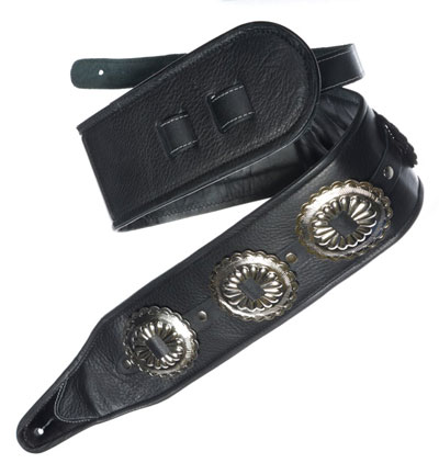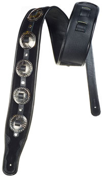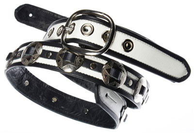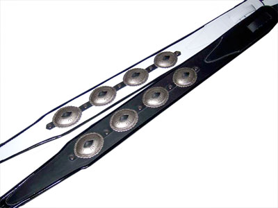 M-Star Concho1.5" wide supple leather with nickle conchos, 100% leather lined body with blue or black binding. Adjustable with nickle buckle.Available in white with black binding, brown with black binding, black with blue binding and black with red binding. |