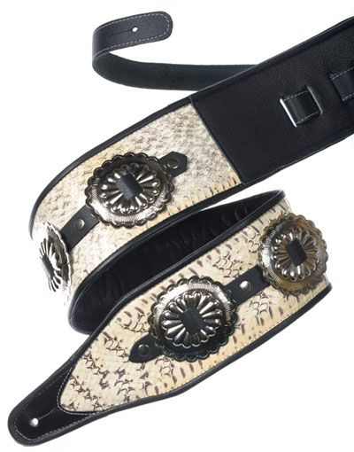 Snakehead3" Genuine two-tone tan snake strap has snake head with crystal glass eyes, 100% leather lined body with studding and conchos. Fully adjustable tail to 55" (60" length available upon request). Leather ends are available in black patent leather or brown leather. See more western styles on our Studded & Western page. |