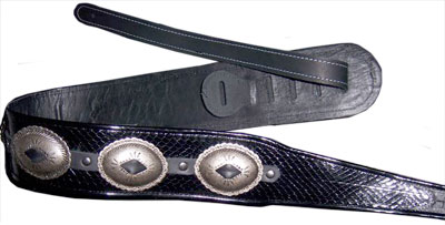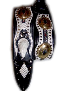 Antique Conchos – 4" wide4" snake skin and leather straps with antique conchos. Leather lining with complete leather body. Fully adjustable tail to 55" long (60" length available). See more western styles on our Studded & Western page |