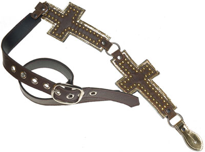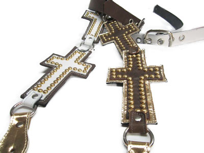 Big CrossMade by hand in our shop in NYC. 1.5" wide leather strap with two 4" x 7" leather crosses with buckles. Leather lining with complete leather body and leather binding. Fully adjustable tail to 55"