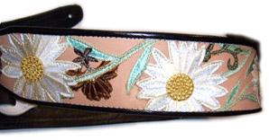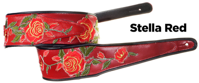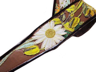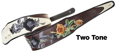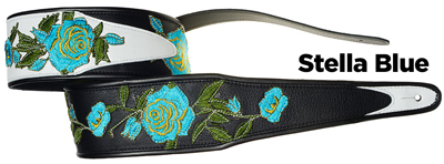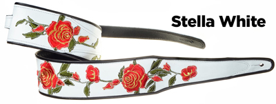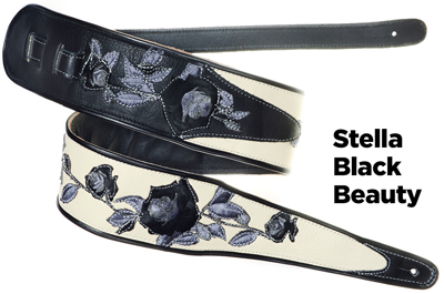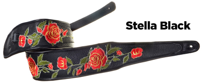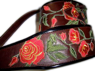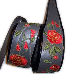 Stella Rose3" wide leather strap with Rose motif embroidered appliques arranged and sewn on. Edged with black binding. Adjustable tail extends to 55" in length (60" length available). |